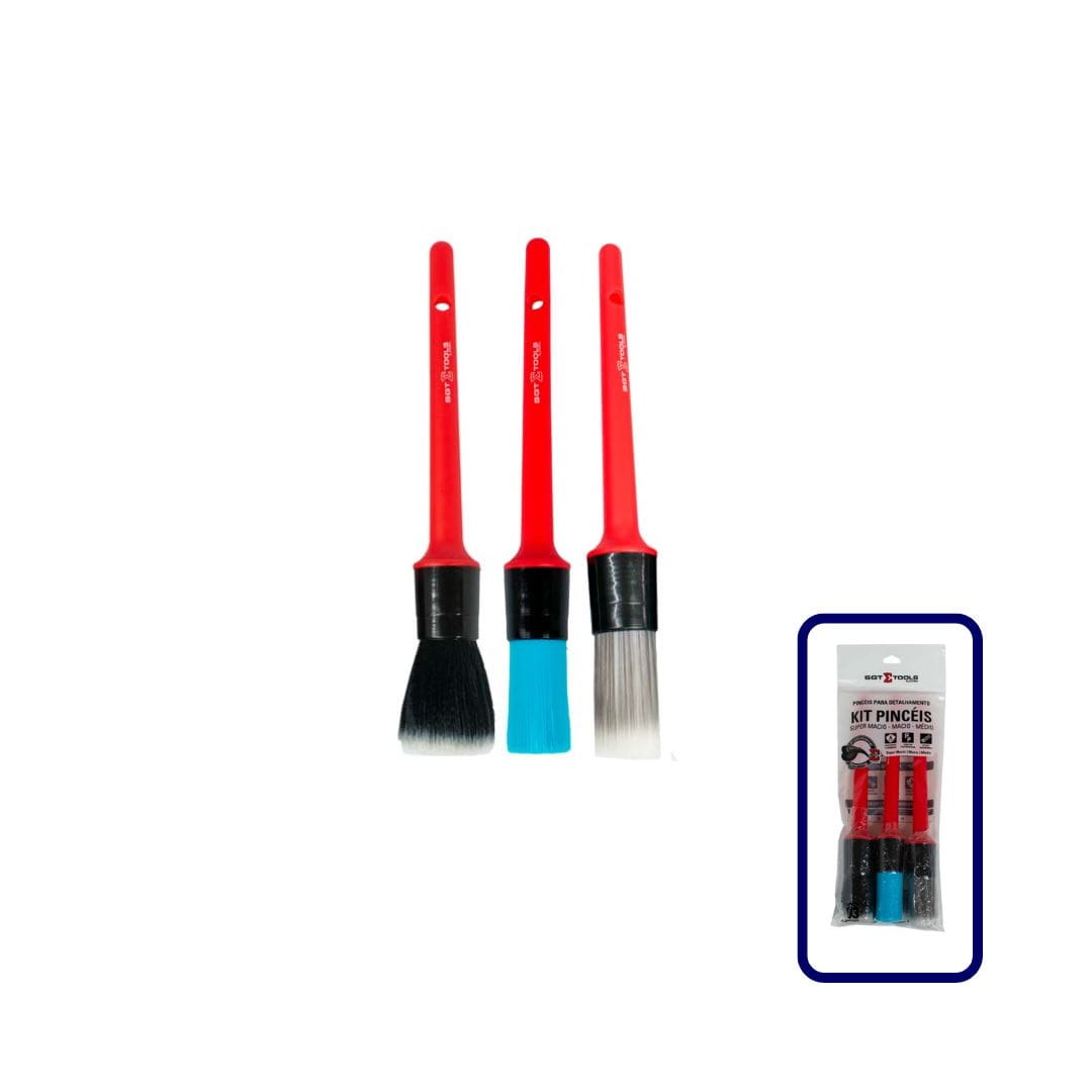 O Kit de Pincéis para Detalhamento é ideal para limpeza precisa em superfícies automotivas, oferecendo diferentes níveis de maciez para cada tipo de aplicação. Composto por pincéis super macio, macio e médio, permite atuar com segurança tanto em áreas delicadas quanto em locais com sujeira mais aderida. Indicado para limpeza interna e externa, é perfeito para alcançar frestas, emblemas, saídas de ar, cantos e acabamentos, garantindo um resultado mais detalhado e profissional. Seu tamanho proporciona conforto no manuseio e maior controle durante o uso, tornando o processo de limpeza mais eficiente.